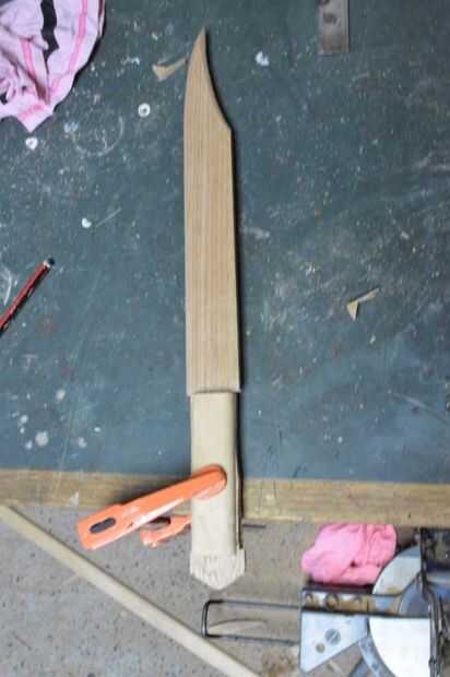 se trata de cómo hacer una espada de madera cuando no tienes un pedazo grande de madera. Si tiene cualquier duda pregunte.Paso 1: en primer lugar, dibujar el diseño sobre la madera, asegurándose de sacar una pieza que sobresale de uno y un espacio en