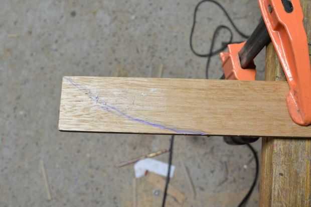 2. Sujete la madera a una superficie plana y con una sierra de calar se corta la sección marcada