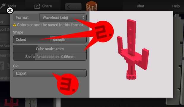2. elija Wavefront (.obj) como el formato de exportación. Aquí están algunas opciones que hemos encontrado que funciona bien: