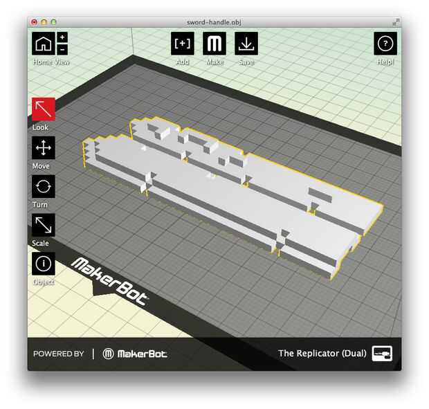 Nuestra impresión, usamos rojo y clarofilamentoPLA . Necesitamos ayudas para el Manejo de la espada pero no para la hoja. Esa parte parece imprimir bien sin. Ambas partes necesitan la balsa.