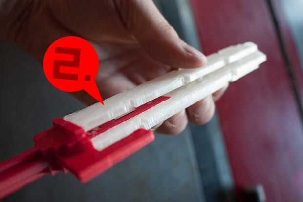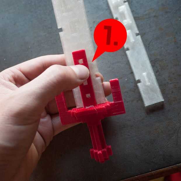 2. a continuación sandwich la empuñadura entre las más grandes y más pequeñas mitades de hoja. Aquí es donde usted puede ser que necesite un martillo. Es importante para el ajuste a ser apretado por lo que las partes permanecen juntas. Pero ten cuidado! Impresiones 3D pueden ser frágiles.