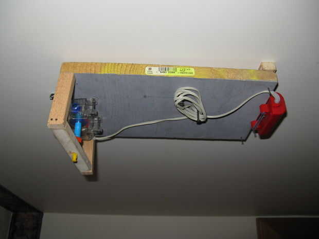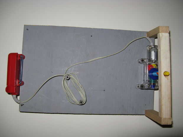 Utiliza un pedazo de madera como base, atornilla el motor (aprovechando los agujeros destinados a k'nex ir a través) y construyó un poco arco de soporte para asegurar que el eje del motor no sag. Me deslicé la batería en algunos clavos hacia la parte inferior, asegurándolo con una banda elástica por lo que se podría quitar y rellenado. Esta posición también hace accesible cuando se sujeta la espiral, como controla el motor. Usé dos tornillos más a mantener el cable organizado. Recogieron el alambre y lo coloca primero tiró el montón al lado con la batería conectada a la base hasta que sienta apretado. Marqué dos puntos dentro de los bucles y es donde poner los tornillos. También he añadido a un pequeño separador en la parte inferior para favorecer una postura erguida y mantener la batería de querer deslizar.