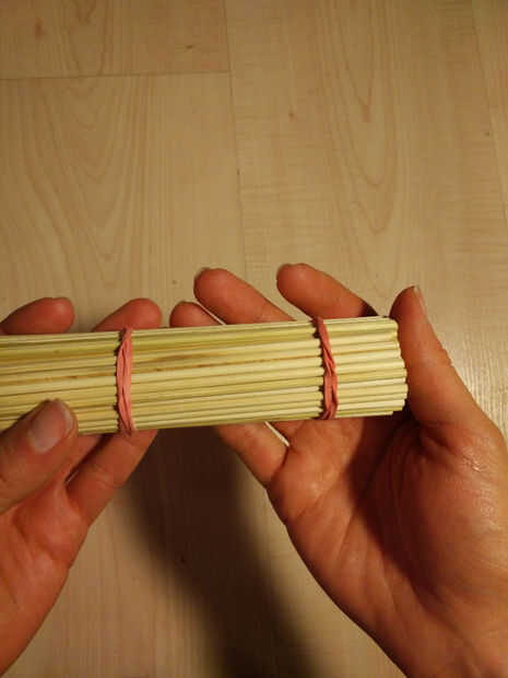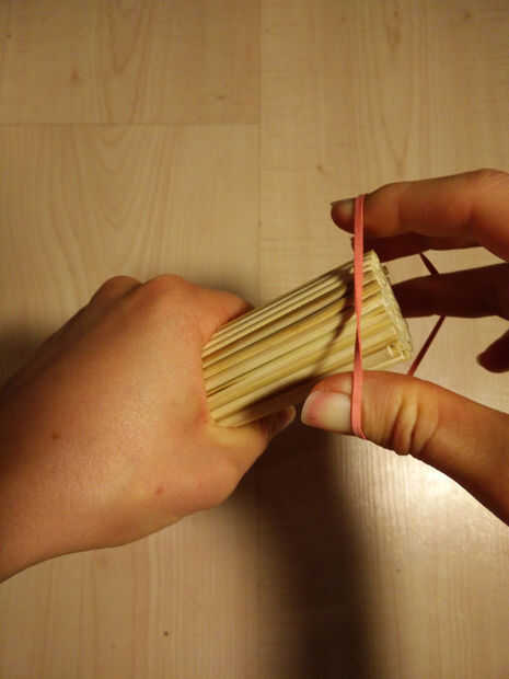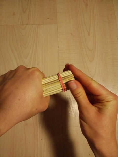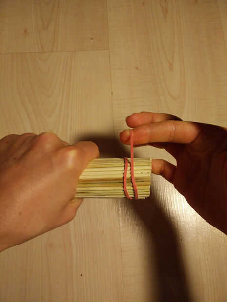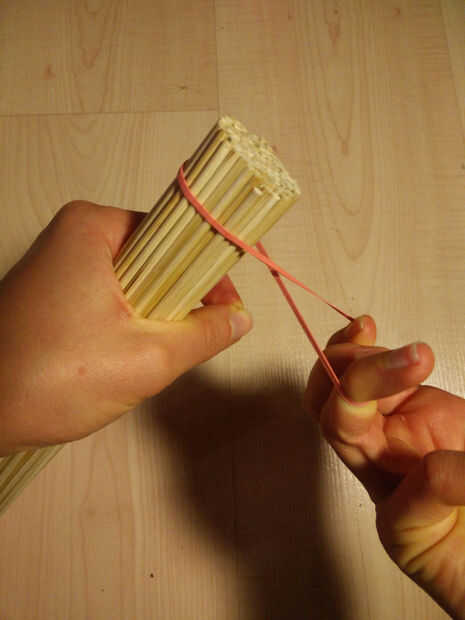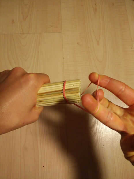 1. En primer lugar, mantenga los pinchos de 100 bambú firmemente en una mano mientras Coloque su primera elástica con la otra. Tienes que enrollar el elástico en dos veces (o más dependiendo de cuánto tiempo su elástica es - debe ser en bien).