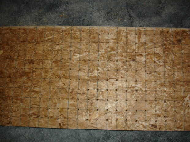 Primera cosa a hacer es a disposición donde vas a perforar. La escala que utiliza para la medición es muy recta y exactamente 1" de ancho, así que en lugar de medir con él, solo utiliza la escala sí mismo como un espaciador, guarnición de un borde con la línea anterior y marca el borde opuesto. Es más importante para lo que será una rejilla de agujeros para ser coherente que para que sean exactamente de 1", ya que las partes que en ellos se hará para. Probablemente uno podría hacer su agujero espaciado 1-1/2 o 2" y ahorrar un montón de perforación. Una vez que tengas todo el tablero establecido, es tiempo de taladro (y el taladro, el taladro y taladro).