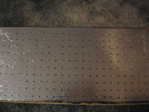 Después de la limpieza y el aserrín del tablero, rociar una capa de adhesivo en la Junta. Siguiendo las indicaciones del adhesivo, colocar una capa de papel de aluminio para la Junta. Cuando está configurado, tome un pedazo de varilla de soldar o una broca y poke a través de la hoja donde están los agujeros. El papel hará más fácil de limpiar.
