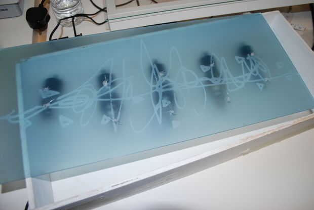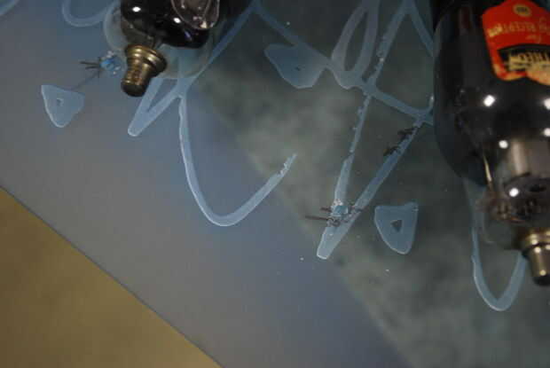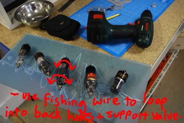 -Medida entonces perforar dos arriba uno al otro o donde quieras los objetos en la pantalla. Usar hilo de pescar para atar la válvula en la parte superior e inferior. Lenguado cola la pistola encoladora en donde de nuevo la válvula de la válvula. Tire del cable a través de la espalda, entonces otra vez dab la pistola encoladora sobre el plexiglás, asegúrese de que las válvulas estén colocadas para que queden todos verticales.
