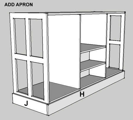 11. agregar la parte frontal, posterior [H] y lado delantales [J] a la base de la estructura, según el diagrama Delantal añadir.