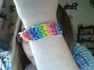 Esta es la pulsera como se verá cuando esté terminado. Yo recomiendo usar 3 colores diferentes para esta pulsera. Antes de poner las bandas en el paso siguiente Asegúrese de que doble todas las bandas, si crees que me refiero a hacer una banda de la