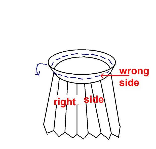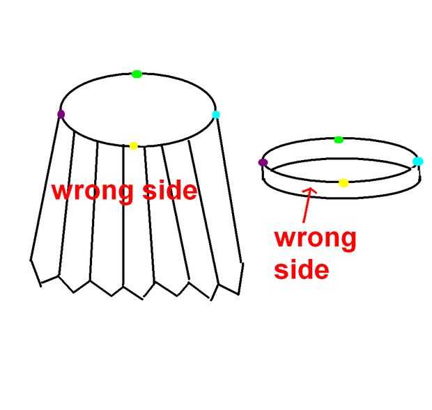 Con el revés de la falda, perno de la pretina, dentro-fuera, a la falda, puntos coincidentes y puntada (la cinta de costura todo el camino alrededor).