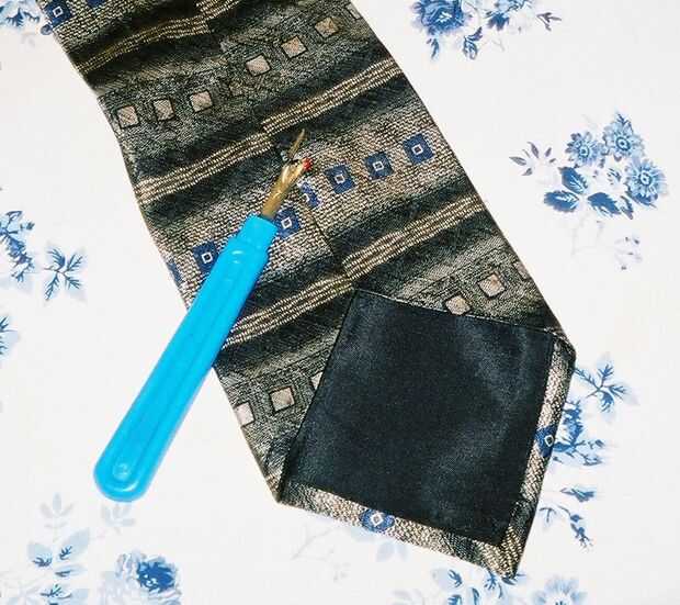 A continuación, ver que el extremo ancho del lazo tiene una puntada gruesa justo debajo de donde estaba la etiqueta, y el extremo angosto tiene uno similar. Costura-rip ésos y tire hacia fuera y tire los hilos de rosca.