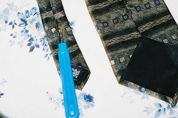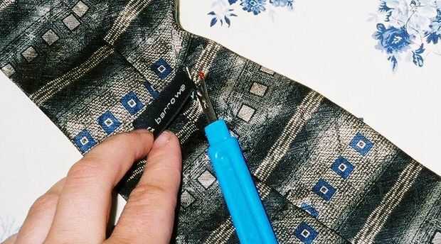 En primer lugar, quitar la etiqueta con el descosedor, teniendo cuidado de no rasgar el empate. Hay tres formas principales de que estas etiquetas se unen--los extremos cortos cosidos un nudo en cada esquina; pegamento. Si usted puede elegir de la cola, o no importa el residuo, fino... de lo contrario desechar ese lazo.