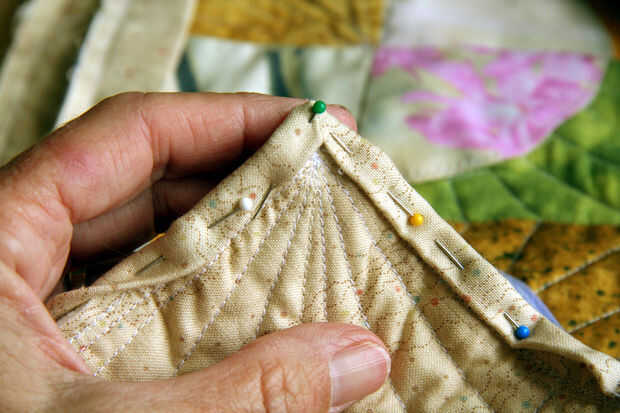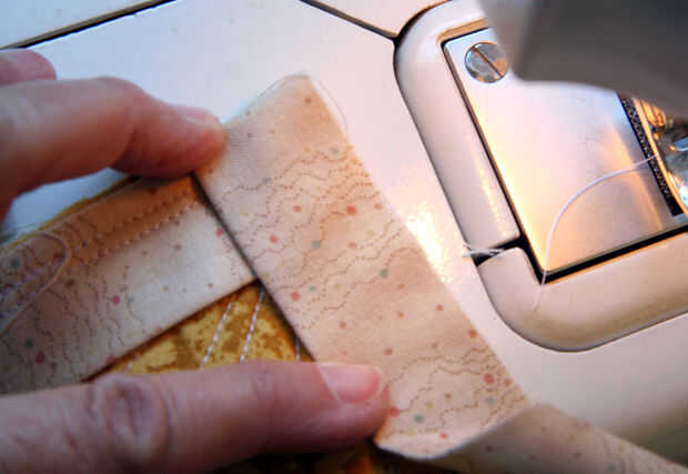 Cortar tiras amplia de 2 pulgadas de enlace lo ancho (a lo largo de la trama) de grano recto de la tela, lo suficiente para cubrir los cuatro lados de la colcha. Hacer una tira continua, coser todas las tiras juntas en las costuras diagonales. En un extremo de la tira, cortar diagonalmente y presiona un margen de costura de 1/4 de pulgada. Doblar las tiras por la mitad longitudinalmente y presiona. En la parte superior de la colcha, posición vinculante bordes incluso con el borde de la parte superior de la colcha y pin en su lugar. Coser una 1/4-costura, después de las fotos para las esquinas a inglete. Cuando regreses a la parte superior, meta final en el principio de la tira y terminar de coser.