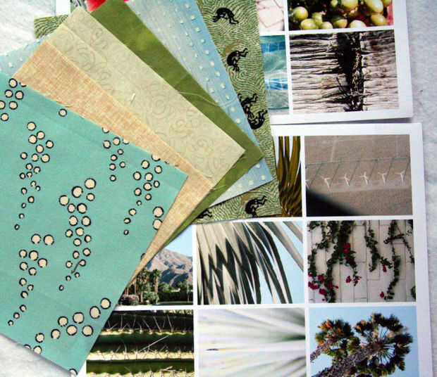 quería mi edredón que sobre el desierto, especialmente donde viven mis padres. Así que me di un paseo por su barrio con mi cámara y fotografiados formas, colores y texturas que dijo algo acerca de su comunidad del desierto, como cactus, palmeras, montañas y cielo. De vuelta en casa, también pasé por mis archivos de fotos de anteriores visitas a encontrar imágenes que eran importantes para mis padres, incluidos los o añadido a mi colección de desierto formas, colores y texturas. Luego imprimir mis fotos favoritas sobre el papel (cerca de 9 por página) y tomó las páginas de la tienda de tela, para seleccionar a telas que complementan y mejoran las imágenes de la foto.