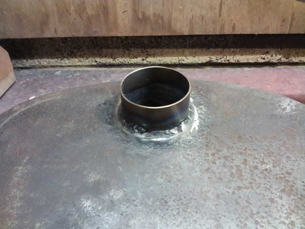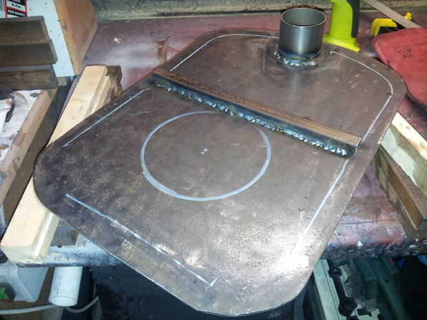 La mejor manera que encontré era colocar algunos bloques de madera en el Banco y coloque la placa superior hacia abajo sobre ellos con el tubo colgando hacia abajo y realmente descansando sobre el Banco de trabajo. Así debe ser en ángulo recto perfecto cercano al Banco y así debe la placa superior.