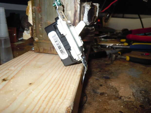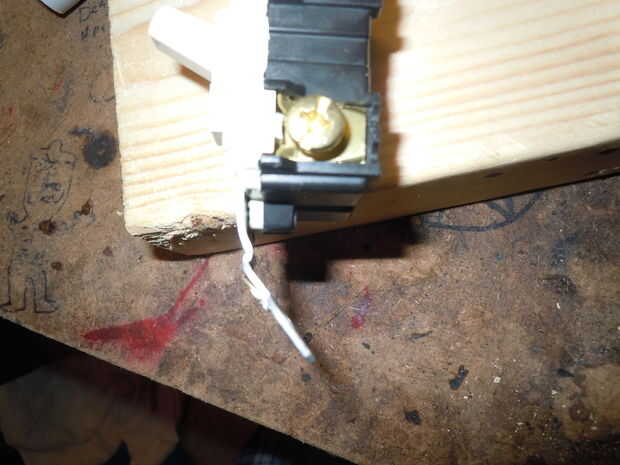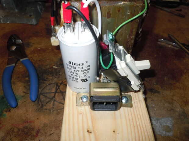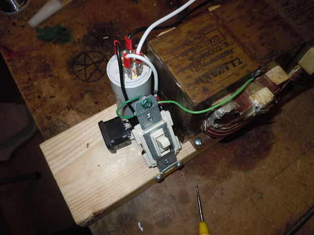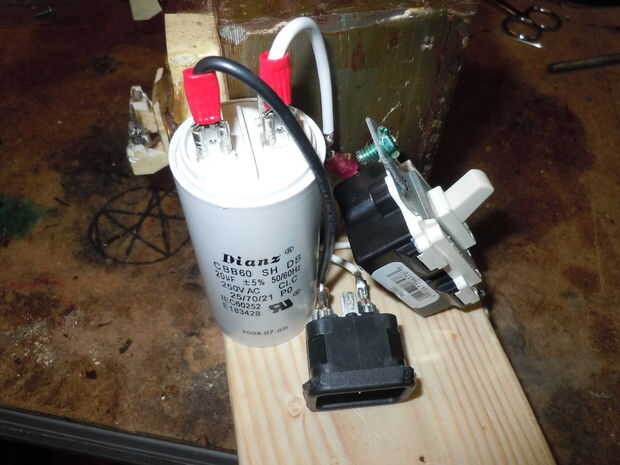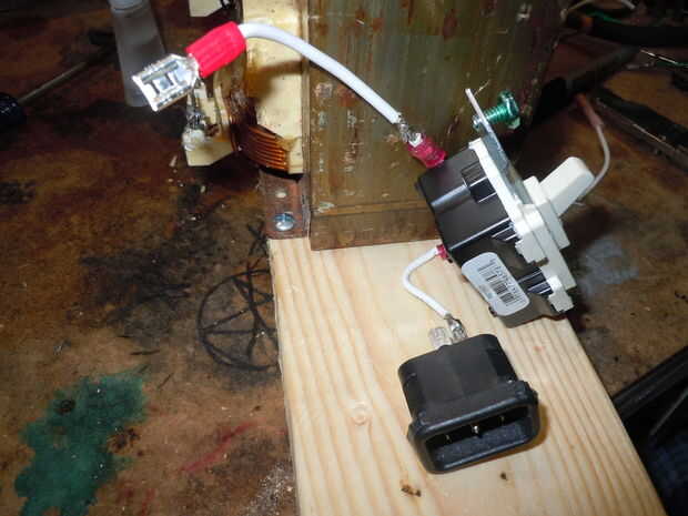 Primero apagado conectar el neutro de la entrada a la zapata de la parte inferior del interruptor. A continuación, conecte un cable desde el terminal superior del interruptor con un conector de horquilla en el extremo para conectar el condensador a (se necesita utilizar el condensador para medir la longitud del alambre). A continuación conecte el vivo de la entrada a otro conector en el condensador. Luego conectar la tierra al tornillo en el conmutador y el otro cable a los núcleos de transformador, soldadas sólo hasta el final en la bobina secundaria. Lo último es asegurar todo, doblado un soporte de metal de un montaje de transformador para caber la forma de la entrada y atornillada en su lugar para evitar que se mueve cada vez que barro amasado y desenchúfelo. Sólo utilicé pegamento para sostener el condensador...
