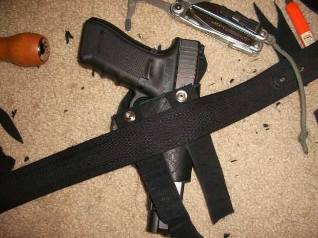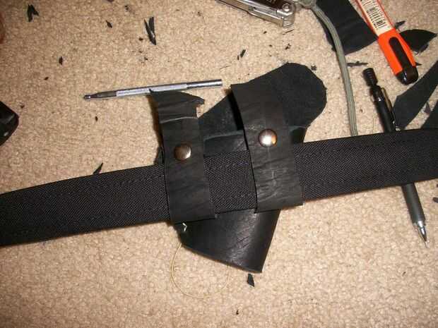Inserte la pistola, baje los lazos y poner el cinturón previsto a través de la correa, debajo de todo el cuerpo de la presión (Asegúrese de que el cierre entero puede verse). Luego doblar la tira de la presilla, por la banda y presione el cuero duro en el extremo posterior de la presión por lo que deja una huella en el cuero, luego perforar, poke o taladre el agujero para el puesto del cierre delantero.