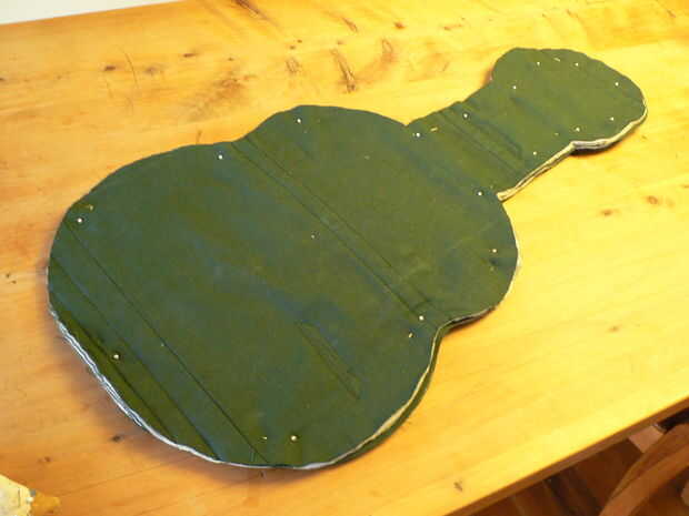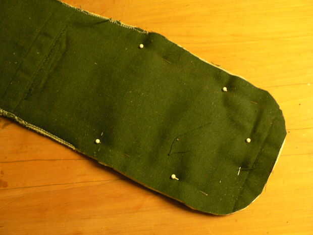 Ahora puede introducir su instrumento en su bolsa de "inside out" y ver cómo encaja. Su un buen momento para ver si habrá problemas o ajustes requeridos. Esto es cuando me di cuenta que la forma ensanchada de la cabeza no era necesario y por suerte habíamos dejado suficiente margen que sólo podía recortar la parte ensanchada y volver a prender y serge se.
