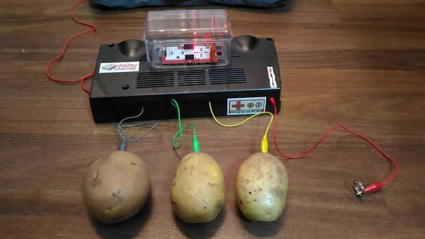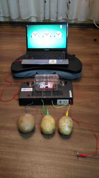 Conecte las patatas a los cables de WASDFG. Colocar un anillo metálico en el cable de tierra. Ese anillo se usaba por el jugador, para completar el circuito cada vez que toca las patatas.