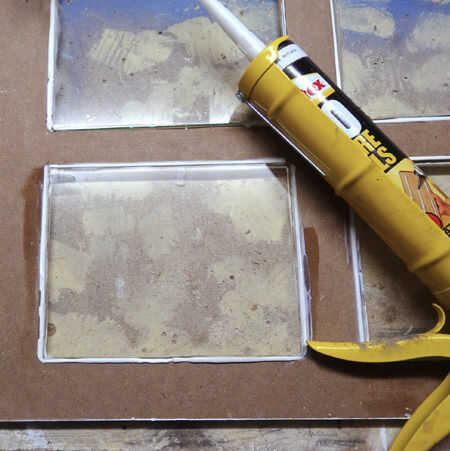 9. una vez seca la pintura, gire la cara de marco hacia abajo y ajuste los paneles de vidrio en las aberturas. Aplique una tira gruesa de pegamento Pattex No más clavos para asegurar los paneles en su lugar. Limpie cualquier exceso con un paño ligeramente húmedo y luego dejar que este seque durante la noche.