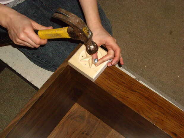 Si te encuentras con problemas de improvisar! Las piezas estrella decorativas que elegí eran demasiado pequeños para caber el martillo en así que tuve que buscar algunos otros grandes tornillos con extremos planos para utilizar como una extensión para llegar a la uña y profundo. Acaba de obtener el clavo mucho en como usted puede sujetar el tornillo en el extremo de la uña y lejos del martillo.