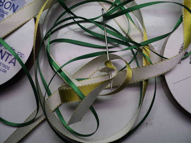 Varias cintas y una aguja grande: utilicé una cinta de raso 3/8" para la gargantilla y satin1/8" para coser la trenza de la guitarra a la cinta de 3/8".