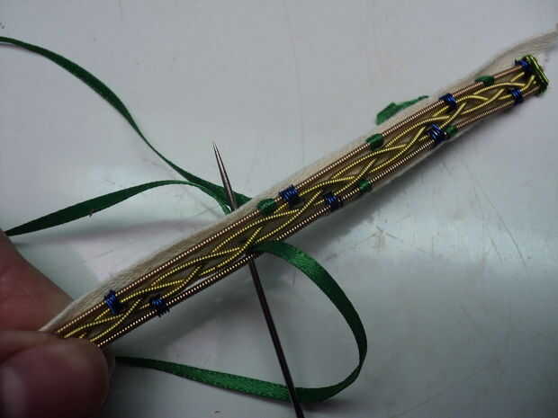 Utilizando la cinta de 1/8", coser la trenza en el centro de la cinta de 3/8".