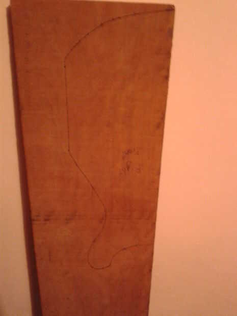 Recuerda que bonito dibujo te lo pasó mucho tiempo en el ultimo paso? Bueno, es hora de tomar las tijeras. Lo siento. Corte los lados de dos cuerpo desde el cuello (que funciona a través del centro del cuerpo, recuerda). Pega los tres a la duela y dibujar alrededor de ellas. Si no de todas las cosas, bueno, vas a tener que diseñar un ukelele o algo no se. O comprar una tabla más grande, lo que funcione.