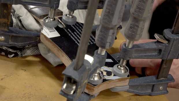 Algunos quick set epoxi te pegamento y el laminado de la abrazadera en el cabezal. Una vez que se seque te lijar al ras y los agujeros de peg ajuste de transferencia.