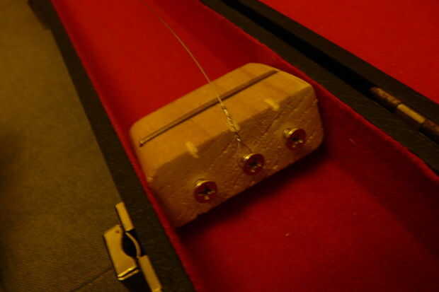 Tallar algunos surcos en el puente a las cuerdas y otro surco longitudinal. Colocar una delgada franja de metal en esta ranura. Usé un viejo traste de guitarra.
