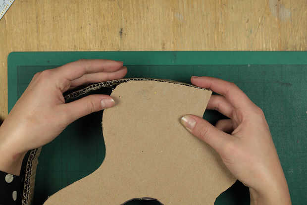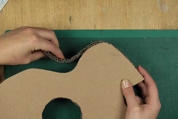 Tome la parte superior de la guitarra y - desde el borde superior, alinee el borde con el pegamento que la pieza superior de la tarjeta y empezar a envolver alrededor del borde. Seguir añadiendo pegamento mientras que usted necesita cuando proceda a través del cuerpo de la guitarra. Una vez hayas hecho el borde completo puede tener algunos cartulina sobrante, solo cortarlo y pegar el borde hasta el punto donde comenzaste. Repita este paso para la pieza de la parte inferior de la guitarra.