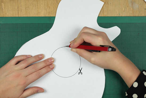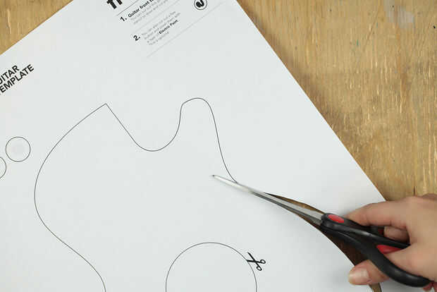 Usando tijeras o una cuchilla de bisturí, siga las instrucciones en la plantilla y corte junto con las líneas. Usted utilizará estas piezas para trazar la guitarra en la cartulina.
