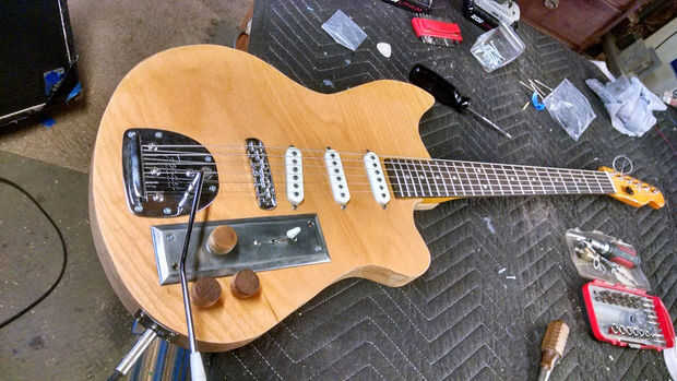 El primer video - y dónde proviene la mayoría de los cuadros en el Instructable - fue hechas de una puerta muy delgada y terminó por fracasar. Necesita un poco más Cruz de fuerza. Hice otro igual de un hueco mejor puerta (segundo vídeo) y acaba de terminar una versión de 6 cuerdas.