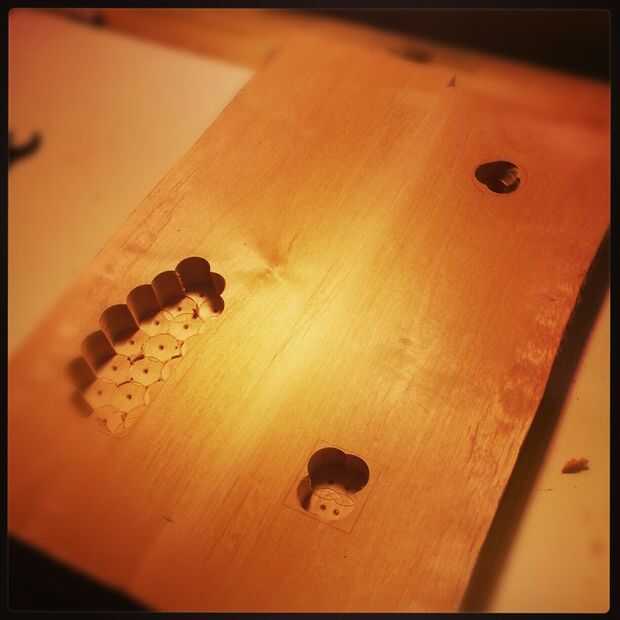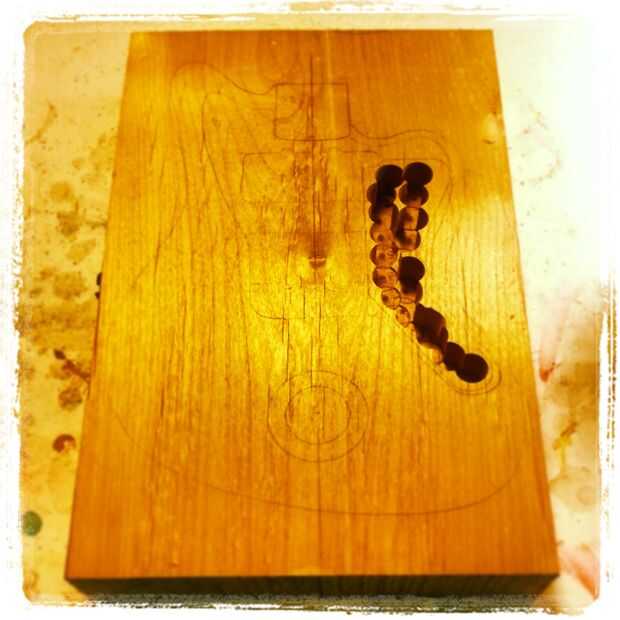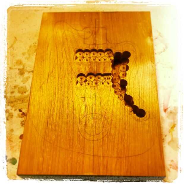 utilizando el taladro y el 1" forstner poco cerdo hacia fuera la mayor parte de las cavidades. Tenga cuidado de no ir a la profundidad. Intento cortar aproximadamente 1/4" a 1/8" menos de la profundidad final. Bueno para tener las piezas (pastillas, puente y el cuello) va a poner en el cuerpo alrededor al hacer este paso por lo que se pueden tomar mediciones precisas y con mejor final resultados.