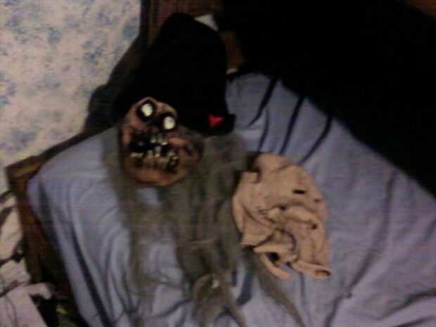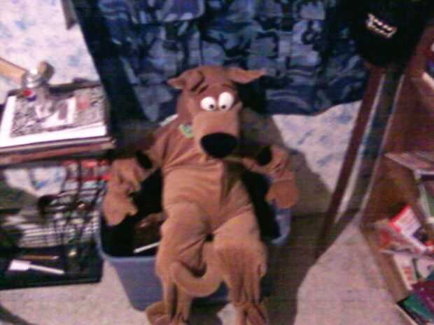 Para mi tema de scooby, por el lado derecho de mi habitación tomé un viejo traje de scooby-doo tenía de 3er grado y rellenos con toallas. Lo puse en un cofre con un zombie y un fantasma.