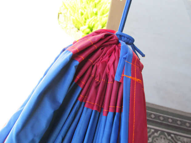 Hice esta hamaca de dos secciones de rip stop nylon cosido juntos. Mientras que una sola capa probablemente habría hecho muy bien, jugué seguro y lo duplicó. No te preocupes si no sabes coser. Probablemente es la 3er vez que nunca he usado una máquina de coser.