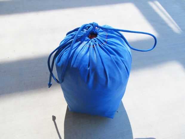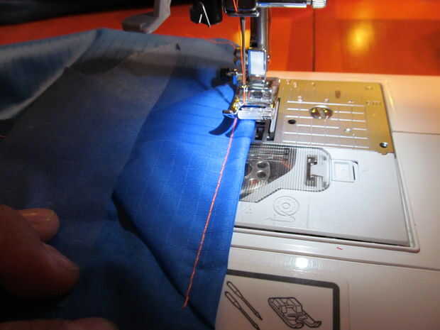 Para unir el lazo me dobla el borde superior de la bolsa sobre y coloca una sección de paracord dentro del doblez. Entonces corrí una puntada todo el camino alrededor de la bolsa, manteniendo la paracord empalmado contra el prensatelas.