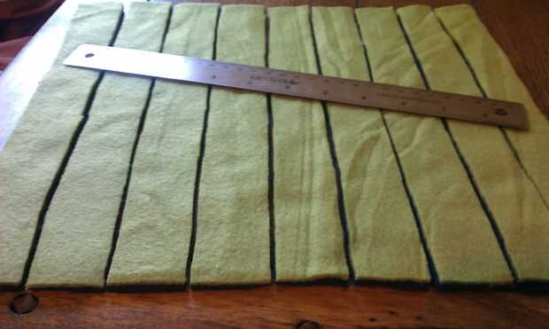 Una vez hayas hecho esto, puede sentar la regla a través de la tela para conectar las muescas y luego corte a lo largo de la longitud de la regla para mantener el corte recto. Después de haber cortado dos paralelo líneas 12" aparte (o cualquiera que sea el tamaño tuyo es), usted puede girar la tela 90 grados y repita el procedimiento para obtener dos plazas básicas, del mismo tamaño.