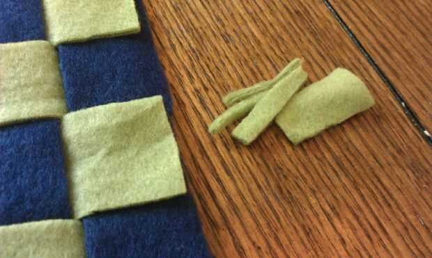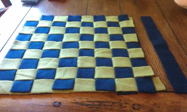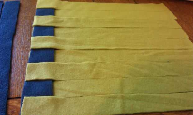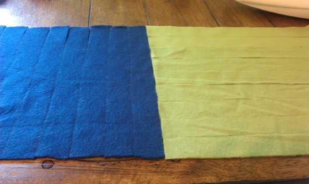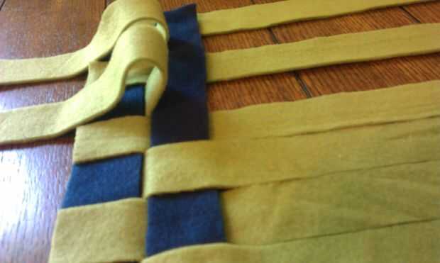 Empezar a tejer que tiras el paño grueso y suave de un color en el otro. La técnica que me pareció más fácil después de la primera tira, fue que tire todas las líneas de la verde que se pone sobre el azul y el conjunto azul abajo en el lugar, cerca a las tiras espaldas dobladas, vuelva a colocar las tiras. Haga espuma, enjuague, repita hasta que todas sus tiras se tejen juntos.