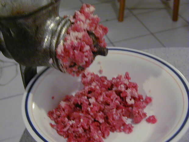 ajuste el portabrocas para un buen equilibrio de carne y grasa y molido, todo agrego sal para resaltar el sabor, le sugiero que haga un plano con un poco de sal para disfrutar el sabor de la carne básica y luego si lo desea, agregue los condimentos, frota etc.. Si no has iniciado el fuego o quieres preparar la hamburguesa primero, enfriar la carne después de moler, moler todo y lo necesita, de sabor superior, evitar congelar la tirada antes o después de la molienda.