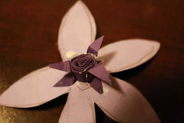 Puede adjuntar la parte central en el eje de la flor, la parte superior para el pétalo, entonces la parte inferior de la tarjeta. Me gusta usar tres en una formación triangular para hacerlo más seguro.