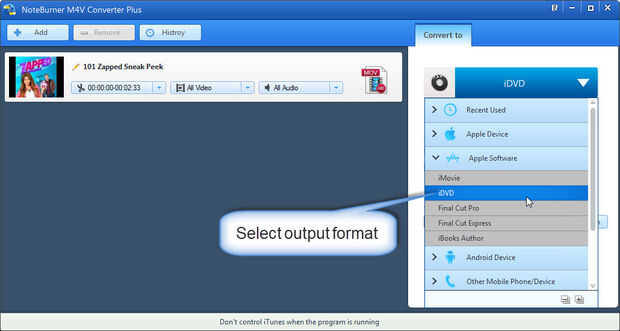 Seleccione la configuración del perfil de salida. Para convertir las películas de iTunes para grabar discos de iDVD, necesita haga clic en la lista desplegable de formato y escoge la opción de "iDVD".