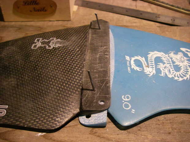 Poner el clavo en un agujero y globo ocular las aletas otra vez antes de perforar el otro orificio de alineación.