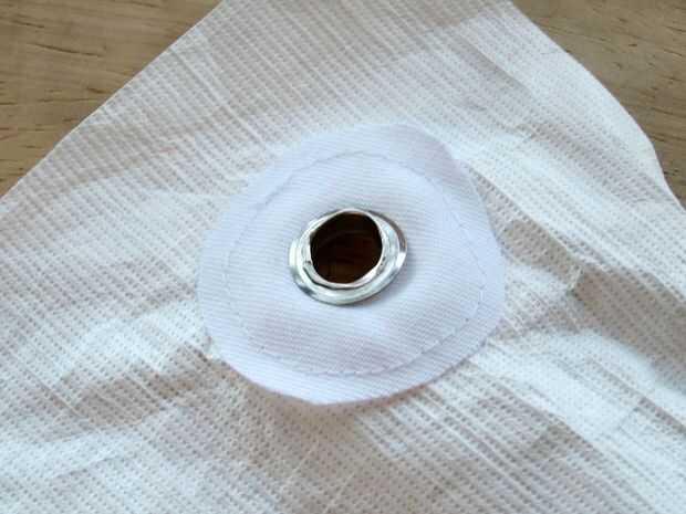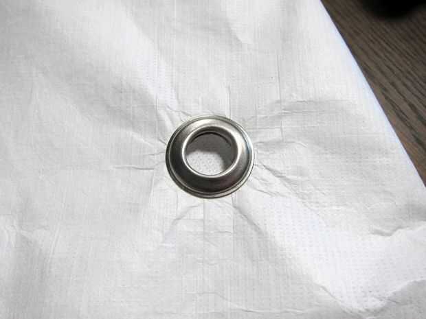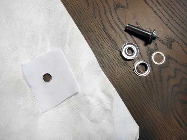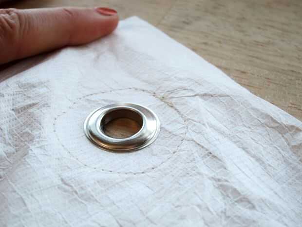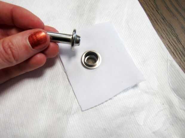 Cortar pequeños trozos de tela reforzada y una abertura a través de dos capas que se ajuste a la boquilla. Lo de la inserción, coloque el respaldo en el otro lado y use la herramienta incluida para martillo abajo. Tenga en cuenta que hice un trabajo terrible. No tenía el respaldo correcto para estos o la herramienta, y mientras que tuvo éxito en colocar los ojales, no bonitas.