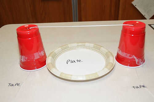 Ahora pase la cuerda por los agujeros en las copas y la cadena de la cinta hacia abajo como se muestra...