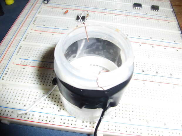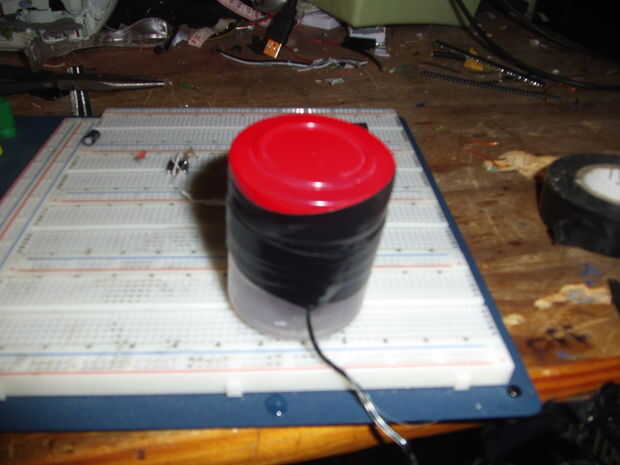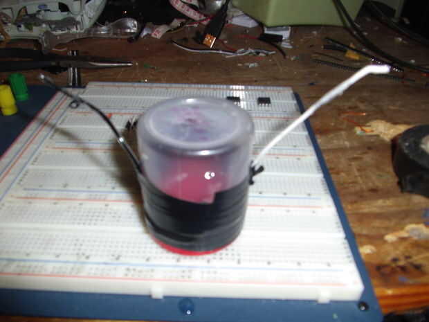 Si no puede pasar los cables la boca del recipiente y luego hacer dos pequeñas ranuras (mantener las ranuras separadas por lo que uno, entonces que hace el otro en el lado opuesto), recorren los cables pelados de las ranuras y fíjelos con cinta aislante, después de cubra el corte con pegamento caliente o epoxi para nada se escapará.