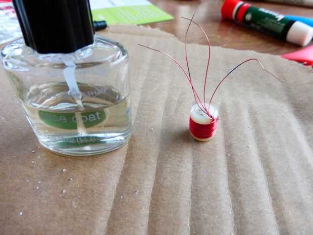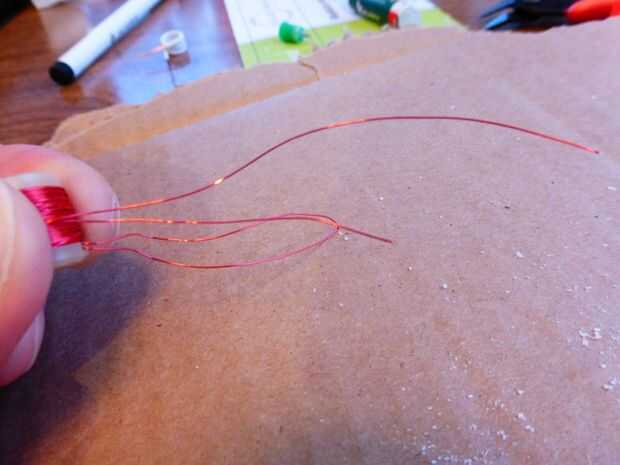 Finalmente, utilice papel de lija, acetona o una hoja de afeitar para quitar el aislante de los extremos de los cuatro cables. Ahora puede utilizar un poco de esmalte de uñas o silicona para pegarlos en el lugar y la bobina de desentrañar.