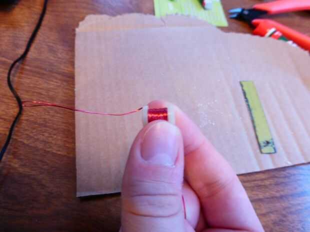 Cuando han dejado unas dos pulgadas de los cables, tome sus tijeras de alambre y cortar el lazo del cable que viene por el lado de la bobina en la mitad. Ahora tienes dos cables separados, herida alrededor de un núcleo magnético. Girar suavemente juntos con el fin de asegurarlos.