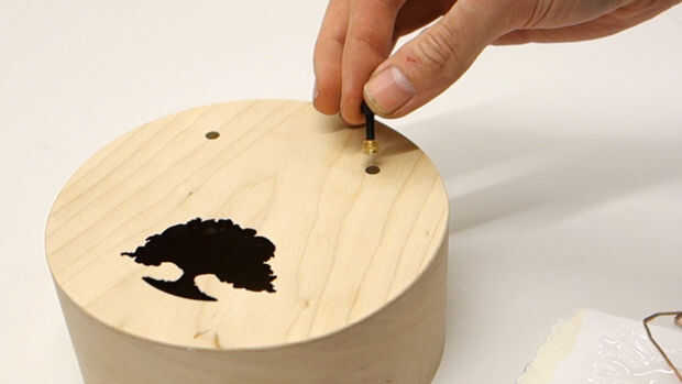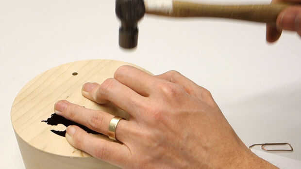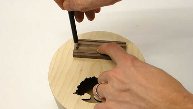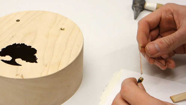 Empezar marcando las posiciones de los orificios de la barra de puesta a tierra en el cuerpo de la kalimba. Luego perfore el cuerpo para los agujeros para inserciones roscadas, que nos permitirá utilizar tornillos mecánicos en lugar de los tornillos para montar la barra de puesta a tierra.
