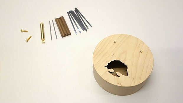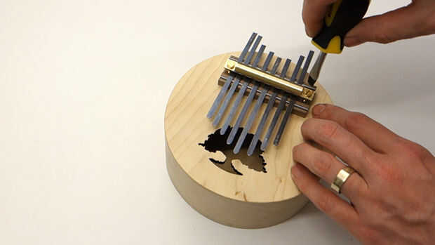 Ahora que tenemos todas las piezas podemos probar que encajan entre sí correctamente. Es solo que hagan una prueba de ajuste ahora, ver que todo se alinea y se ajusta como debería. No se moleste en tuning el kalimba ahora mismo, ya que tiene que desmontar otra vez para el siguiente paso.