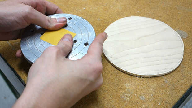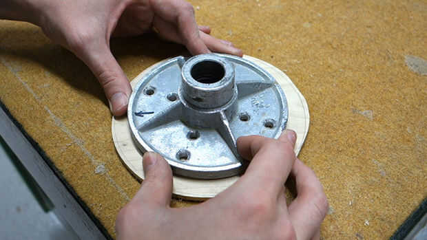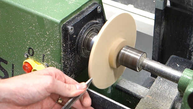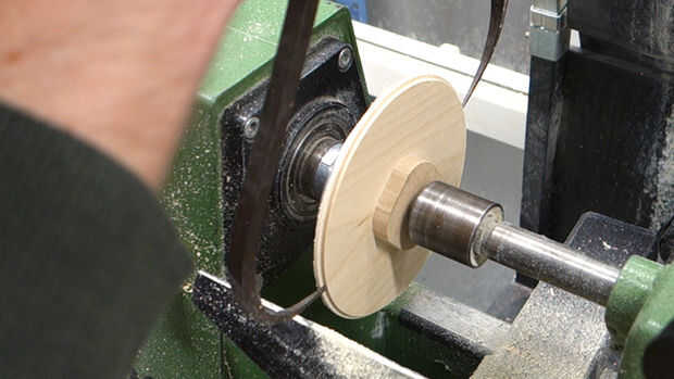Definitivamente no soy un tornero de madera, así que lo que estoy procediendo con un grano de sal. Asegúrese de que usted monte la madera de manera que trabaja con el torno, y que no daña la madera. Utilicé un trozo de cinta adhesiva de doble cara y llevó a cabo la presión contra la madera mediante la acción de la cola del torno y un pedazo de madera en medio para proteger la superficie.